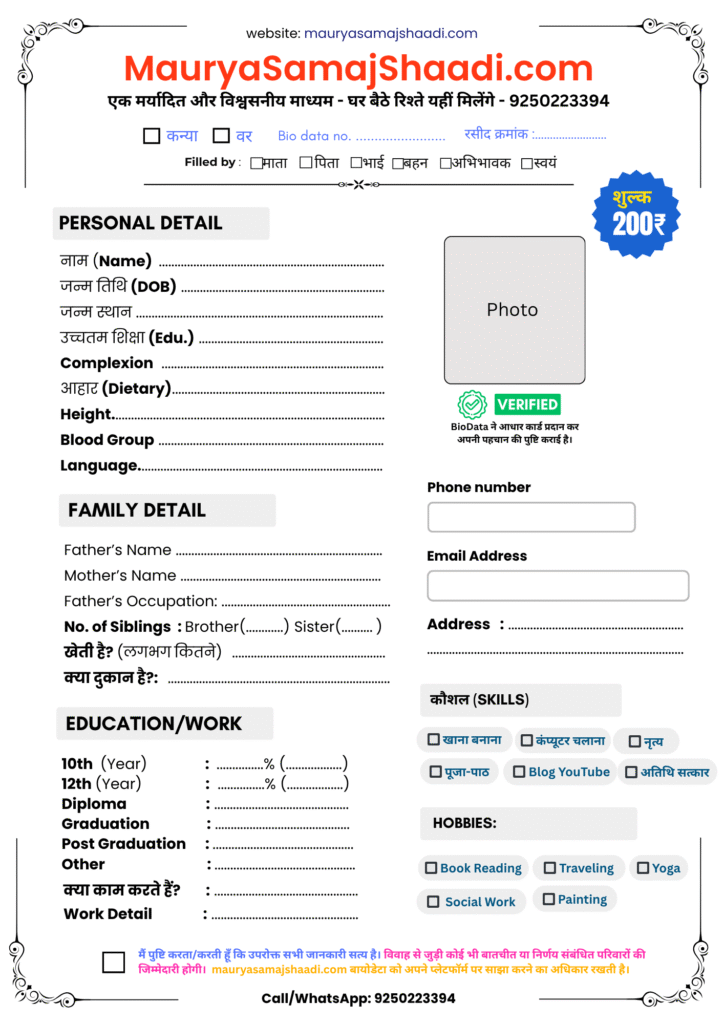 MauryaSamajShaadi.com मौर्य समाज के परिवारों के लिए एक सुरक्षित और विश्वसनीय मंच है। यहाँ आप अपने पुत्र या पुत्री का बायोडेटा जोड़ सकते हैं और समान विचारों वाले परिवारों से जुड़ सकते हैं। हमारा उद्देश्य है सही जीवनसाथी की तलाश को आसान और सम्मानजनक बनाना।