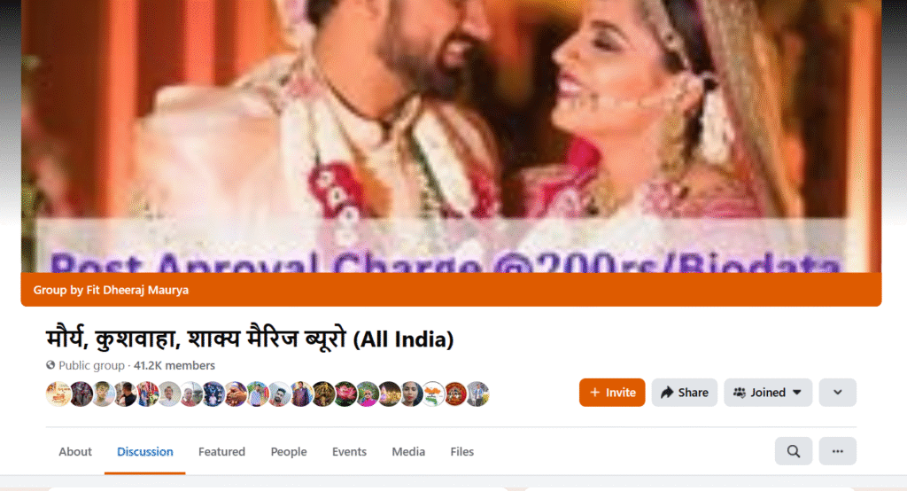 जैसे कि मौर्य समाज के लिए बनी समिति मौर्य समाज शादी(mauryasamajshaadii.com) है जो खास मौर्य समाज के लिए रिश्ते खोजने में मदद कर रही है। यहाँ ऑनलाइन (Online) और ऑफलाइन (offline), दोनों तरीकों से मात्र 500₹ 200₹ रजिस्ट्रेशन शुल्क देकर अपनी शादी के बायोडाटा जमा कर सकते हैं।
