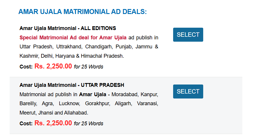 ये दर हर अखबार में भिन्न होती है जैसे कि ‘द ट्रिब्यून’ (The Tribune) में 15 शब्दों के लिए रु 750 से रु 1,100 तक है और ‘अमर उजाला’ (Amar Ujala) में 25 शब्दों के लिए लगभग रु 1818 की दर है। लेकिन इसमें समय ज्यादा लग सकता है।