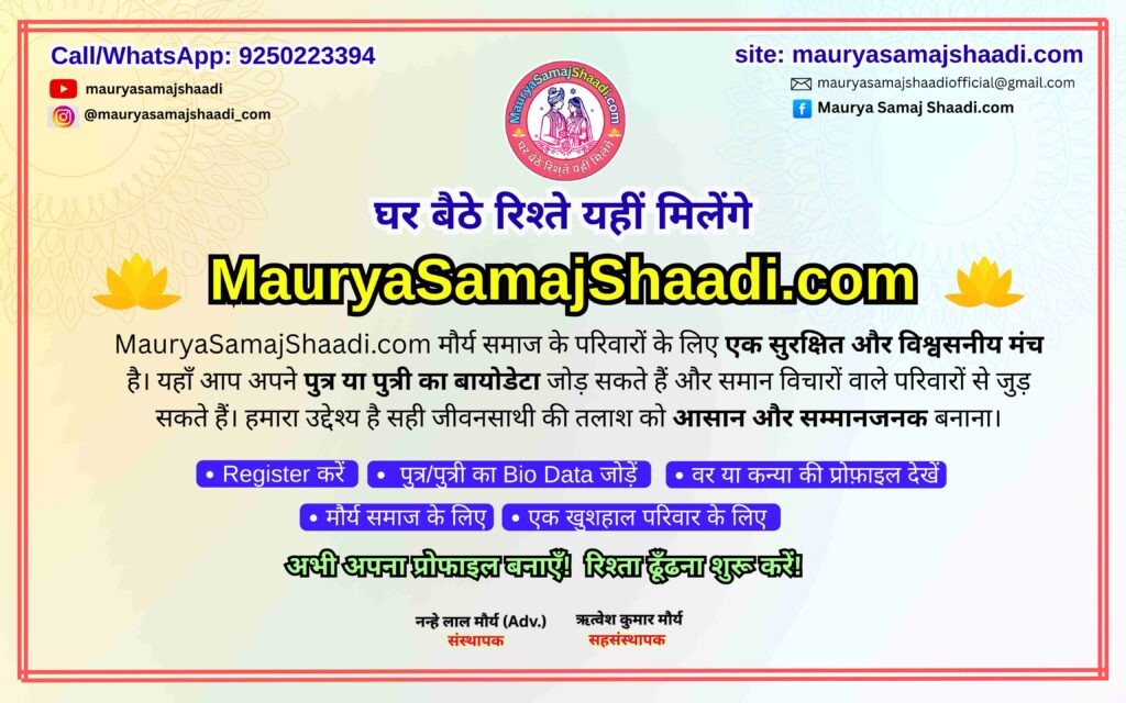 अगर आप Maurya, Kushwaha, Saini, Shakya आदि समाज से है तो आज ही REGISTER करे। यह हमसे इस नंबर पर संपर्क करे 9250223394